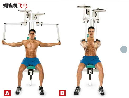 蝴蝶机飞鸟:锻炼胸沟分离度。调整座位高度,使把手与你的肩在同一高度,双臂保持微弯状态,注意双臂不要打开过度(打开到背平面就可以了),以免伤到肩关节,重量不要太重,内收时停顿3秒,充分挤压胸大肌。