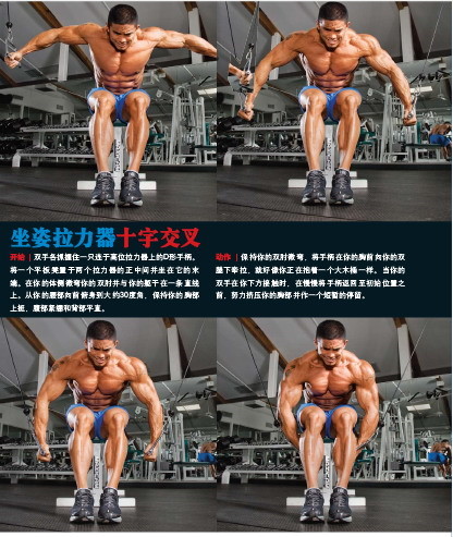 拉力器十字夹胸:锻炼下部胸大肌,中部胸肌。这个动作充血效果很明显,用轻重量多次数,保持双肘微弯,低头含胸,动作顶点努力挤压胸肌。