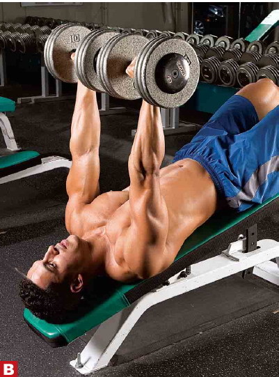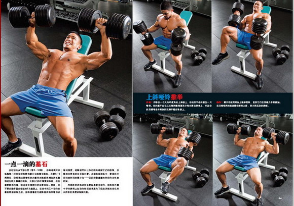 上斜哑铃推举:锻炼上部胸大肌。哑铃比杠铃好处就是没有横杠限制,可以充分拉伸胸大肌,注意不要下放的太低,以免拉伤胸肌。这个练习放在前面做,因为自由重量需要花很大精力。斜板的角度控制在30-45度之间,角度太大对三角肌前束的压力也越大,会影响到胸肌的发力。