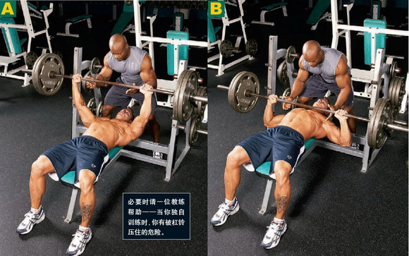 重点锻炼部位:胸大肌、三角肌和肱三头肌。绝大多数的冠军健美运动员把仰握推举作为锻炼上身最好的动作。 B.开始位置:仰卧在平的卧推凳上,两脚平踏在地上。两手掌向上握住横杠,两手间距比肩稍为宽些,两臂伸直支撑住杠铃位于胸的上部。 C.动作过程:使两直臂向两侧张开,两臂慢慢弯屈,杠铃垂直落下,直至横杠接触到胸部(大约接近乳头线上方)。然后向上推起至开设位置,重复坐。 D.训练要点:不要把背和臀部拱起或憋气,这样会使肌肉失去控制,是危险的。
