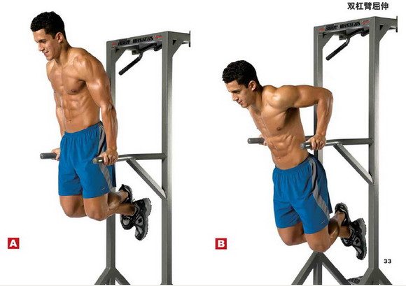 双杠臂屈伸:作为胸部的热身动作,重点打造下胸部。动作要点:双肘夹紧,上身前倾,下巴内收,略含胸,无论起始还是结束都要保持这一姿势,动作底部不要放得太低,以免给肩关节造成太大压力。