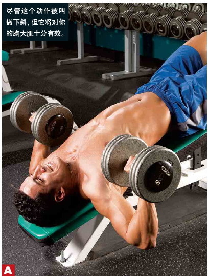 下斜哑铃卧推:锻炼下部胸大肌。主意哑铃或杠铃下放到最下面的肋骨两侧,不要放到胸大肌中间部位,以免给肩关节造成压力。