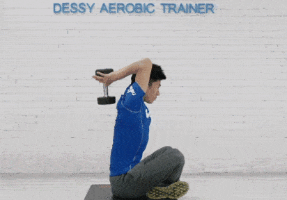 盘腿坐在地上(或横于平板上)双手握住哑铃置于颈后,大臂垂直于地面,注意挺胸抬头不要拱背,向上抬起哑铃,使手臂自然伸直停顿,向下还原到起始位置,整个过程大臂夹紧,不要打开。