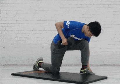右腿跪于地面(或横版)左腿呈弓步,身体呈俯身状,左手放于左脚旁支撑,右手持哑铃,提起哑铃,大臂向上提至最高点,固定不动,小臂垂直于地面,小臂向后发力使手臂呈一条直线,停顿还原到起始位置,注意大臂整个过程固定不动。