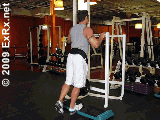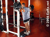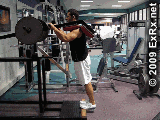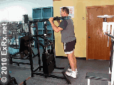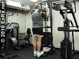 史密斯机上,双手掌心朝前握杠宽于肩,杠铃置于肩后,收腹、紧腰、挺胸,身体直立,膝关节伸直。 2.接着吸气,尽可能高地向上提起脚跟,稍停3~4秒钟。然后呼气,缓慢还原,重复练习。